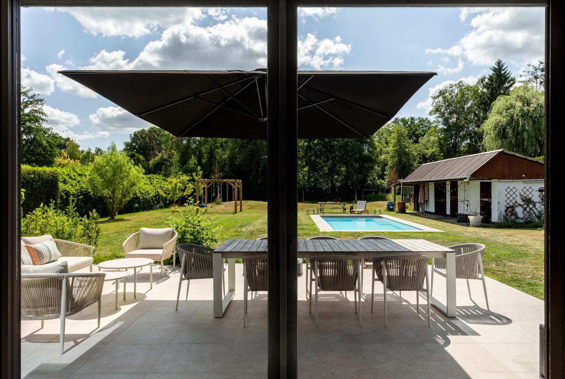 Grâce aux grandes surfaces vitrées, la lumière naturelle pénètre généreusement, conférant à l’espace de vie une atmosphère chaleureuse à tout moment de la journée. Les habitants y savourent de longues soirées avec vue sur le jardin, tandis que la terrasse épurée se prolonge naturellement dans la verdure extérieure. Cette extension de maison réunit sérénité, confort et élégance en un ensemble harmonieux.