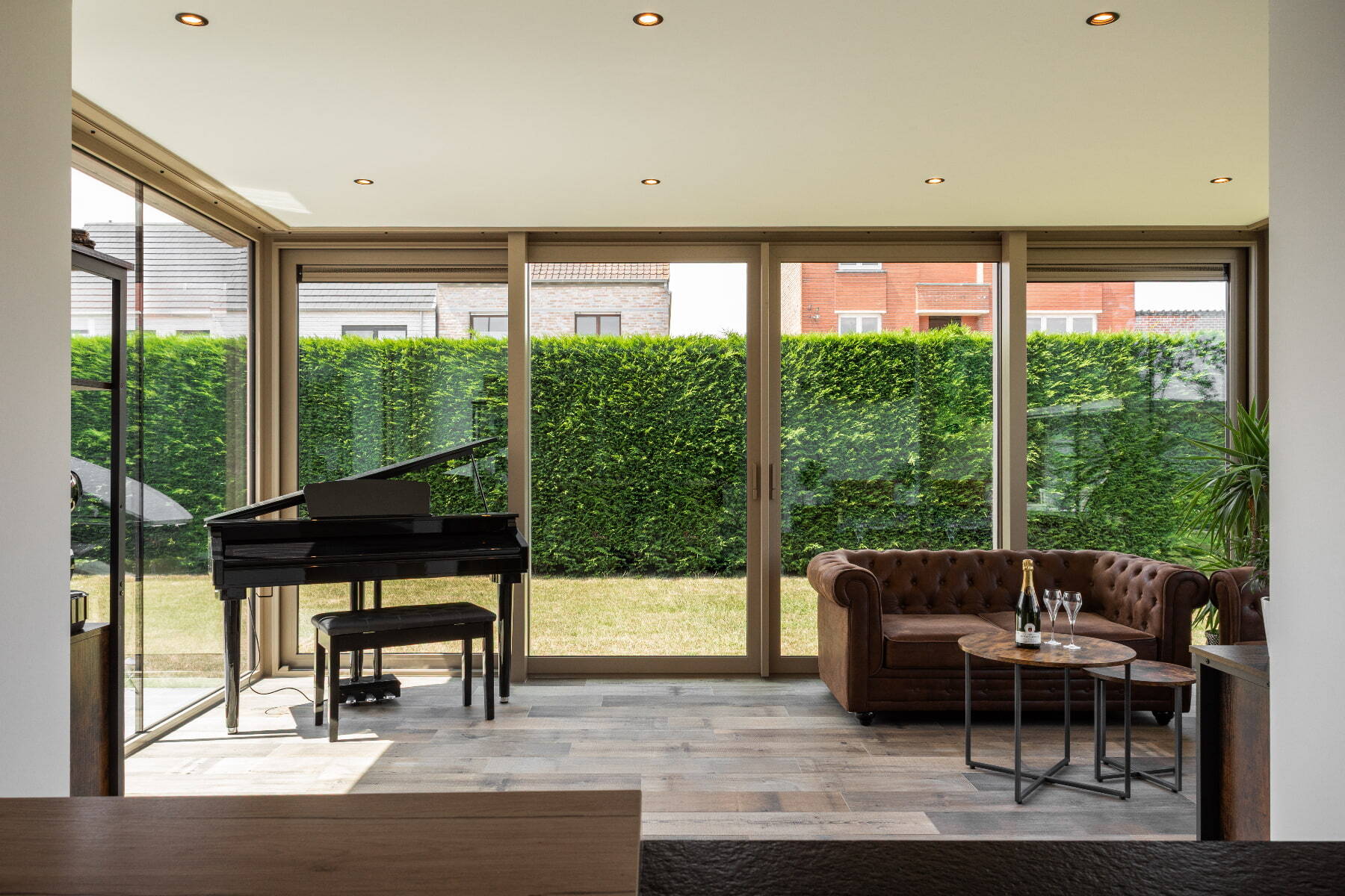 Cette extension de maison en aluminium à Gistel illustre parfaitement l’alliance entre confort contemporain et atmosphère chaleureuse. Les grandes surfaces vitrées invitent la verdure environnante à l’intérieur, tandis que la finition haut de gamme et les teintes naturelles créent une ambiance accueillante. Cet espace est conçu comme un lieu de détente et de créativité. Une extension moderne qui élève à la fois l’habitation et la qualité de vie.