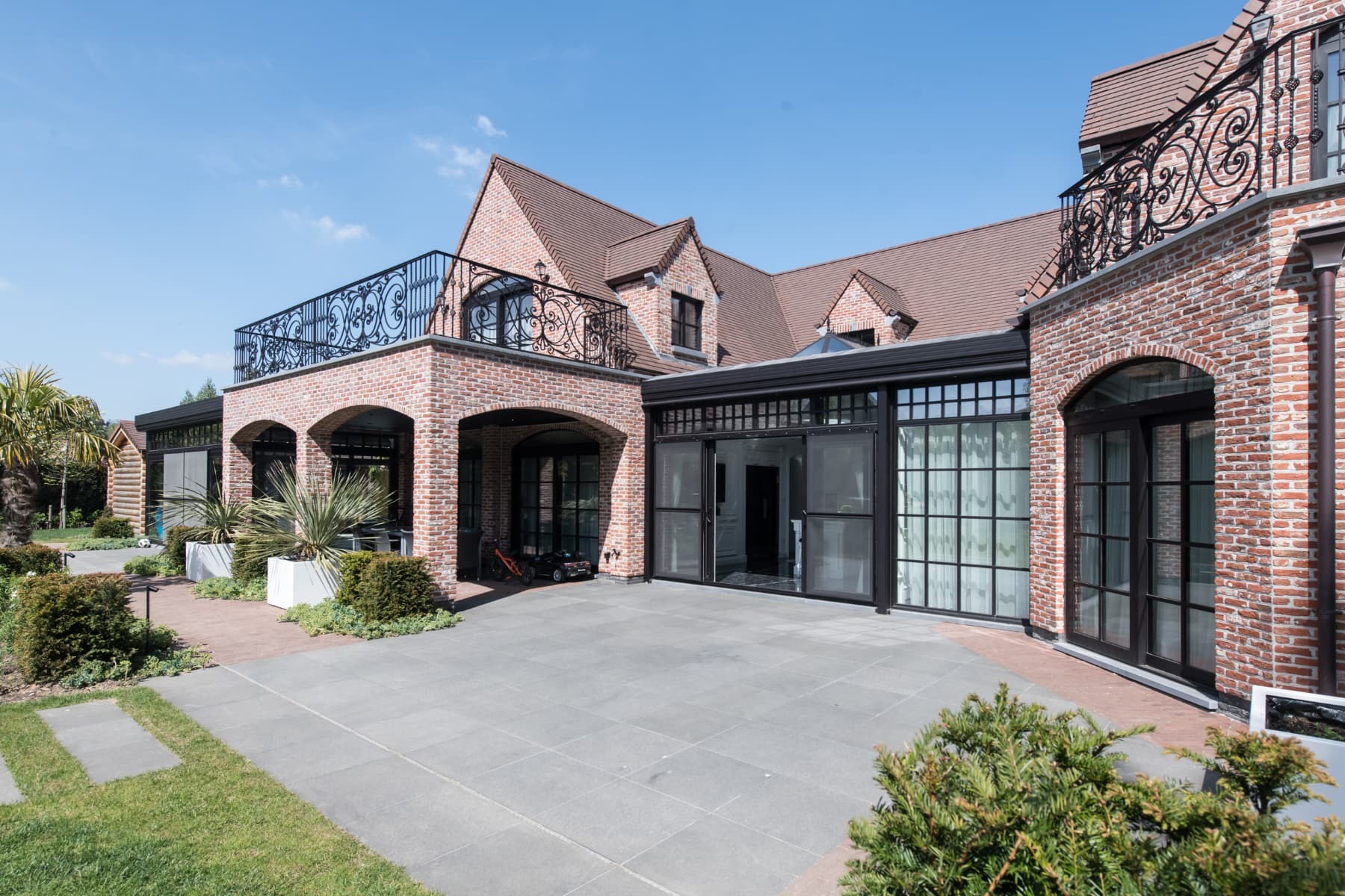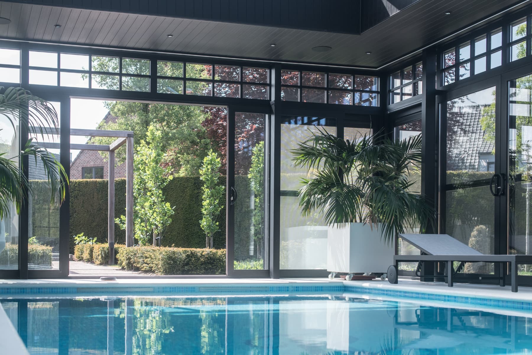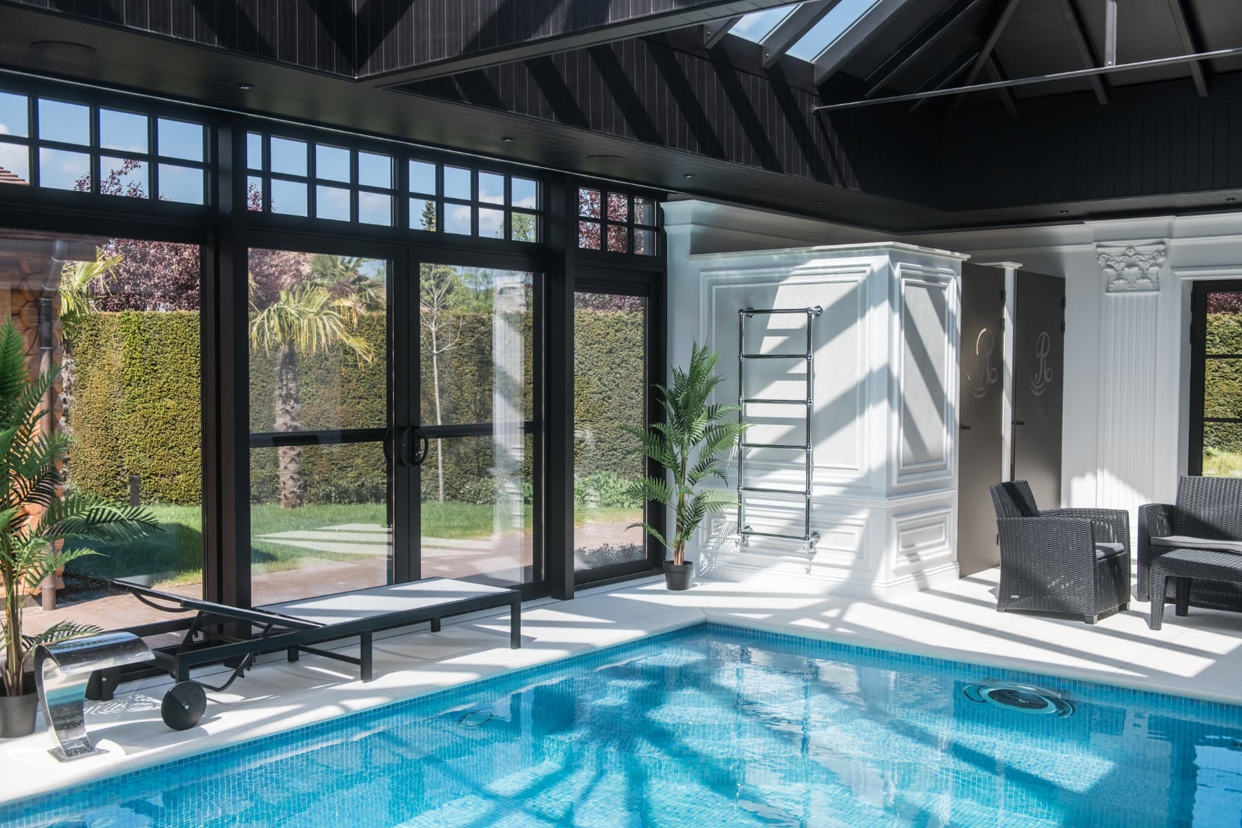 De grandes baies vitrées, un toit à pignon marqué et des finitions soignées font de ce projet un bijou de luxe discret. La structure offre à la fois protection et luminosité, avec une vue dégagée sur le jardin. Ici, vous nagez en toute tranquillité, toute l’année, entouré de confort et d’élégance.
