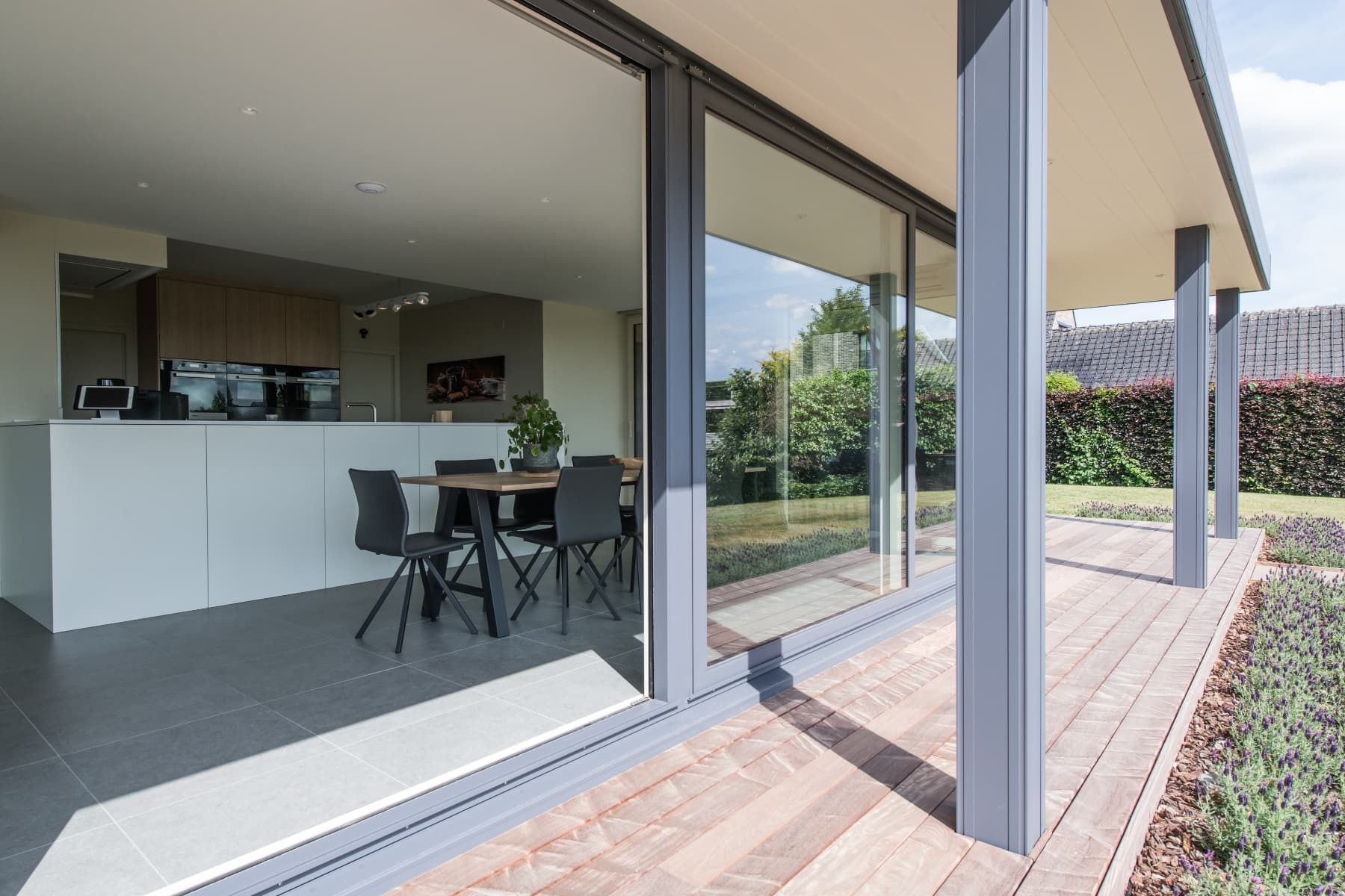 La structure fine en aluminium et les vastes baies vitrées confèrent à l’extension une allure contemporaine et apaisante, tandis que la pergola intégrée offre ombre, protection et ambiance en toute saison. À l’intérieur, la cuisine ouverte et l’espace repas profitent d’une lumière abondante et d’une vue dégagée sur le jardin. L’extension s’intègre parfaitement à la maison, enrichissant le quotidien par un confort accru et une sensation d’espace.