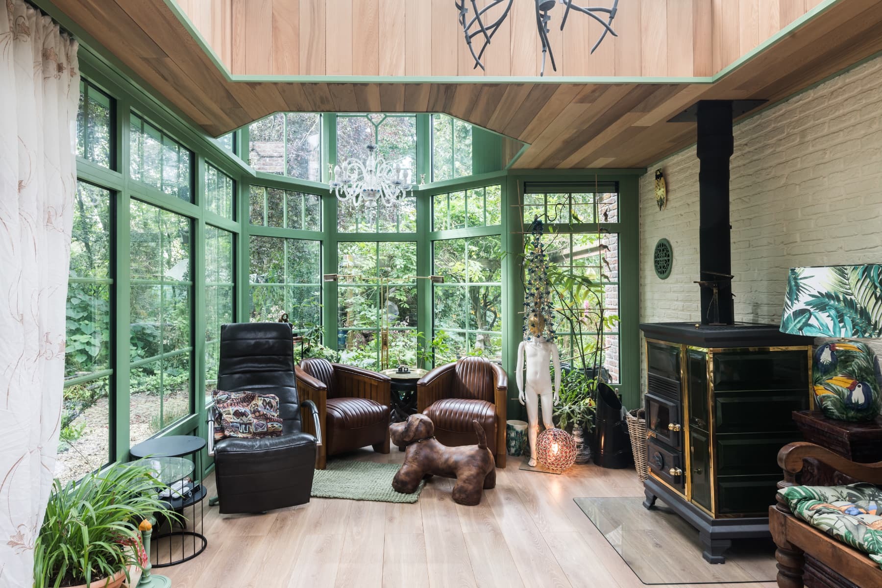 Binnenin zorgt het hout voor een warme sfeer, terwijl het glas rondom volop licht binnenlaat. Omgeven door groen lijkt deze veranda wel een stille getuige van rust en natuur, perfect om je in alle seizoenen even terug te trekken.