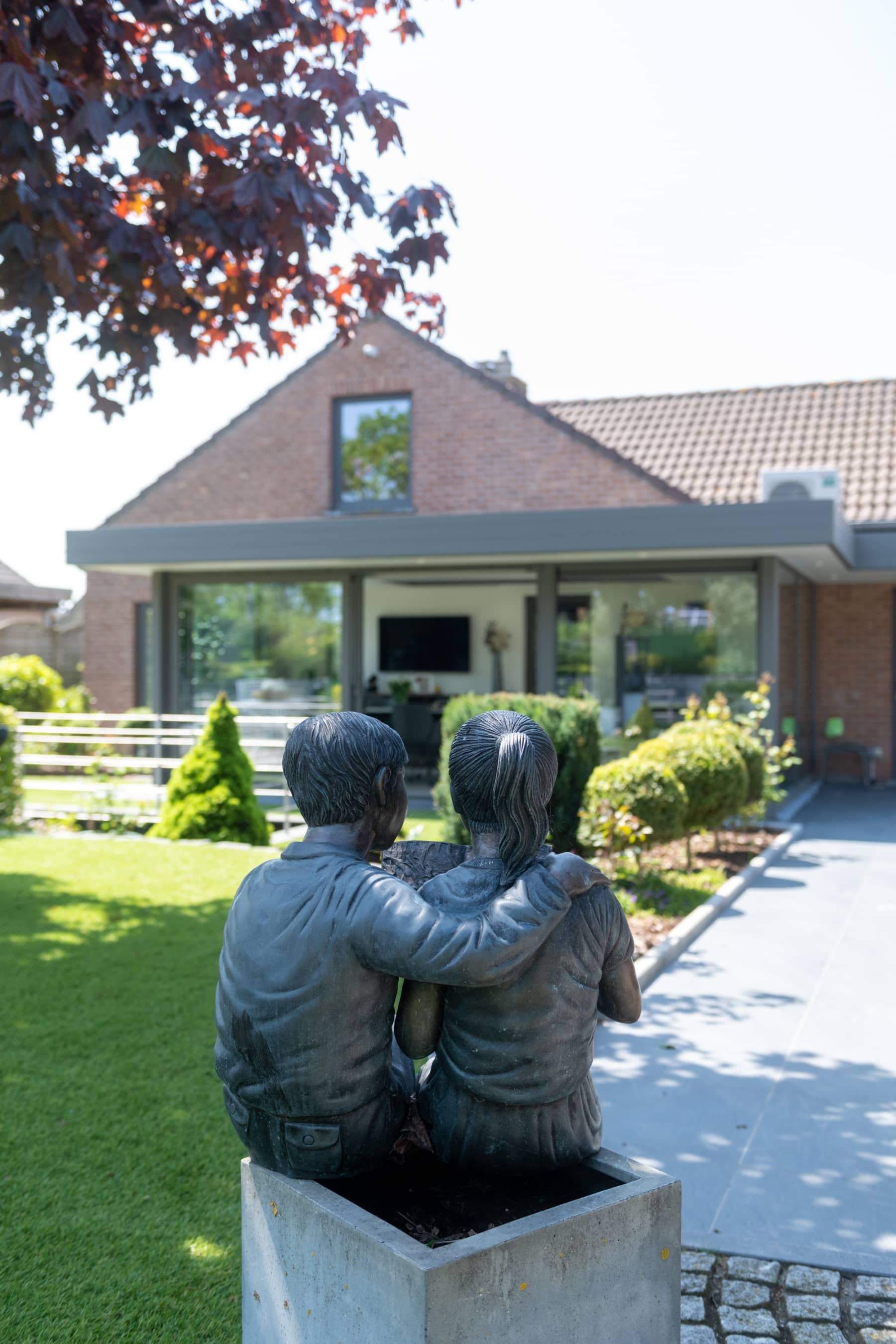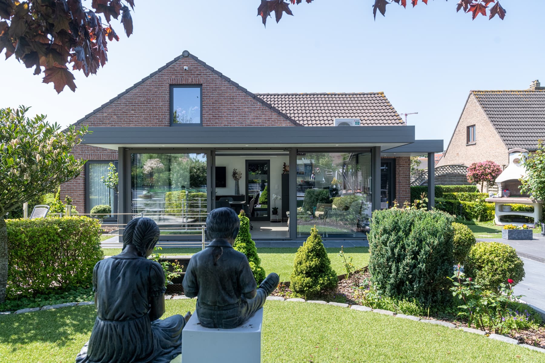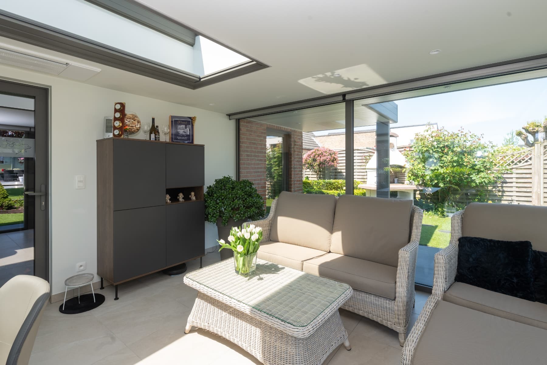 De glazen hoek en brede schuiframen zorgen voor een open karakter waarbij de tuin voortdurend aanwezig is in het interieur. Vanuit elke positie in de leefruimte blijft het zicht behouden op het groen en de diepte van het perceel. Hierdoor verandert de woonomgeving mee met de seizoenen en het daglicht.
