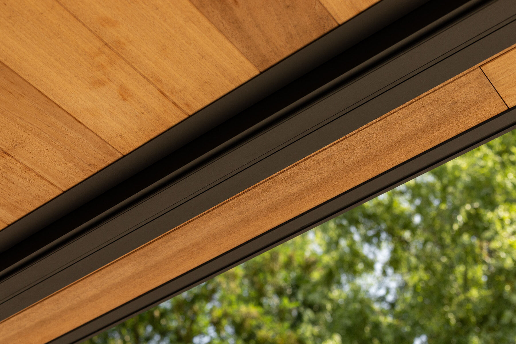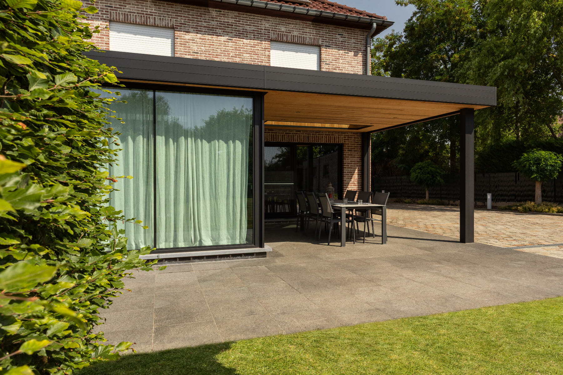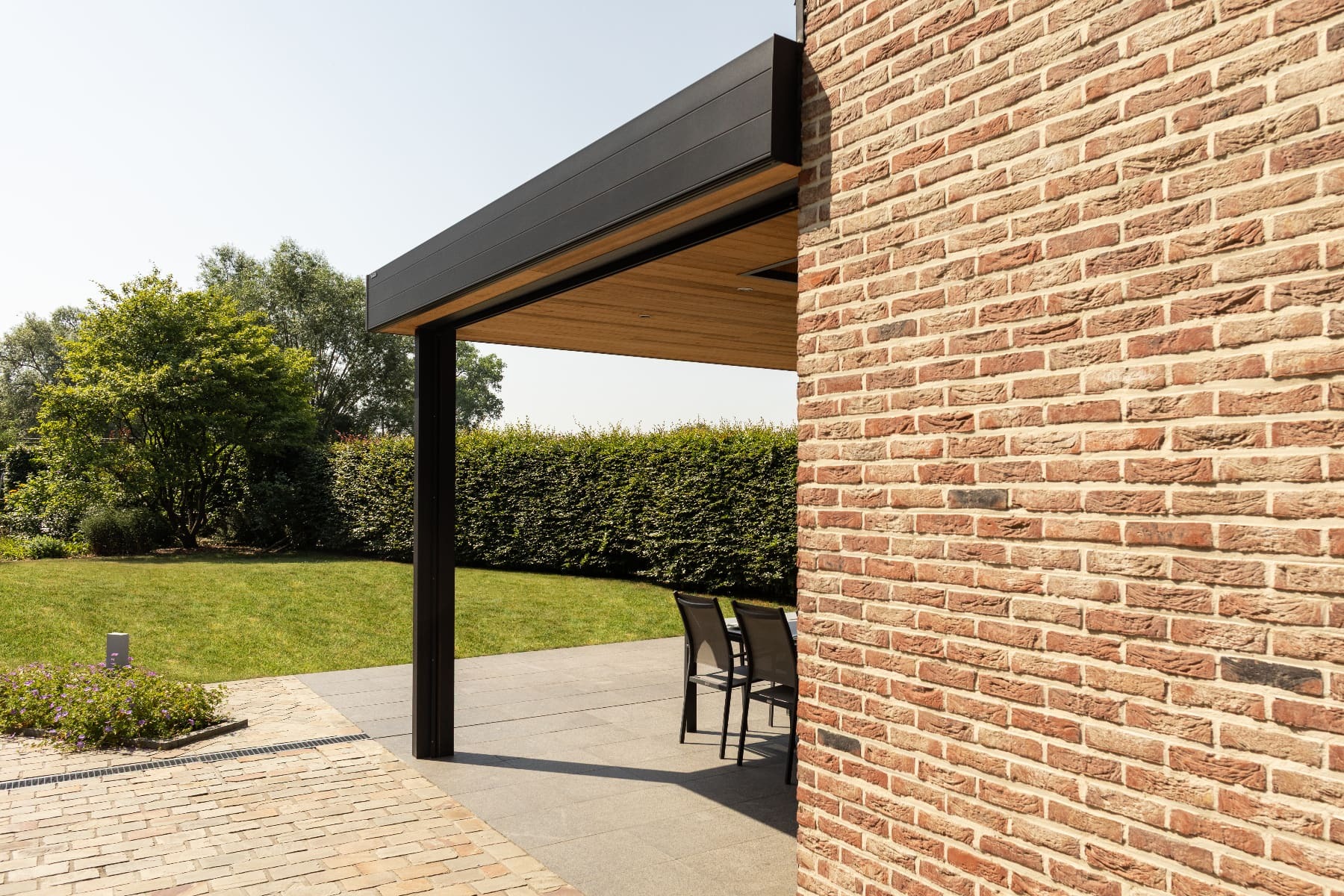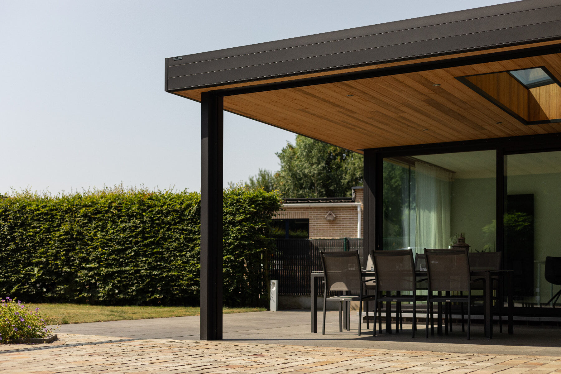 Deze woonuitbreiding in Haaltert koppelt een lichte leefruimte aan een pergola die bescherming biedt tegen zon en regen. De donkere aluminium structuur contrasteert mooi met het warme hout en sluit naadloos aan bij de bestaande bakstenen gevel. Binnen en buiten vloeien hier moeiteloos in elkaar over. Een woning die klaar is voor elk seizoen.